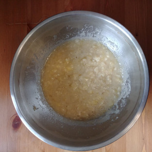 Mash 2 bananas until soft. Add 2 eggs and whip together. Add the dry ingredients together.